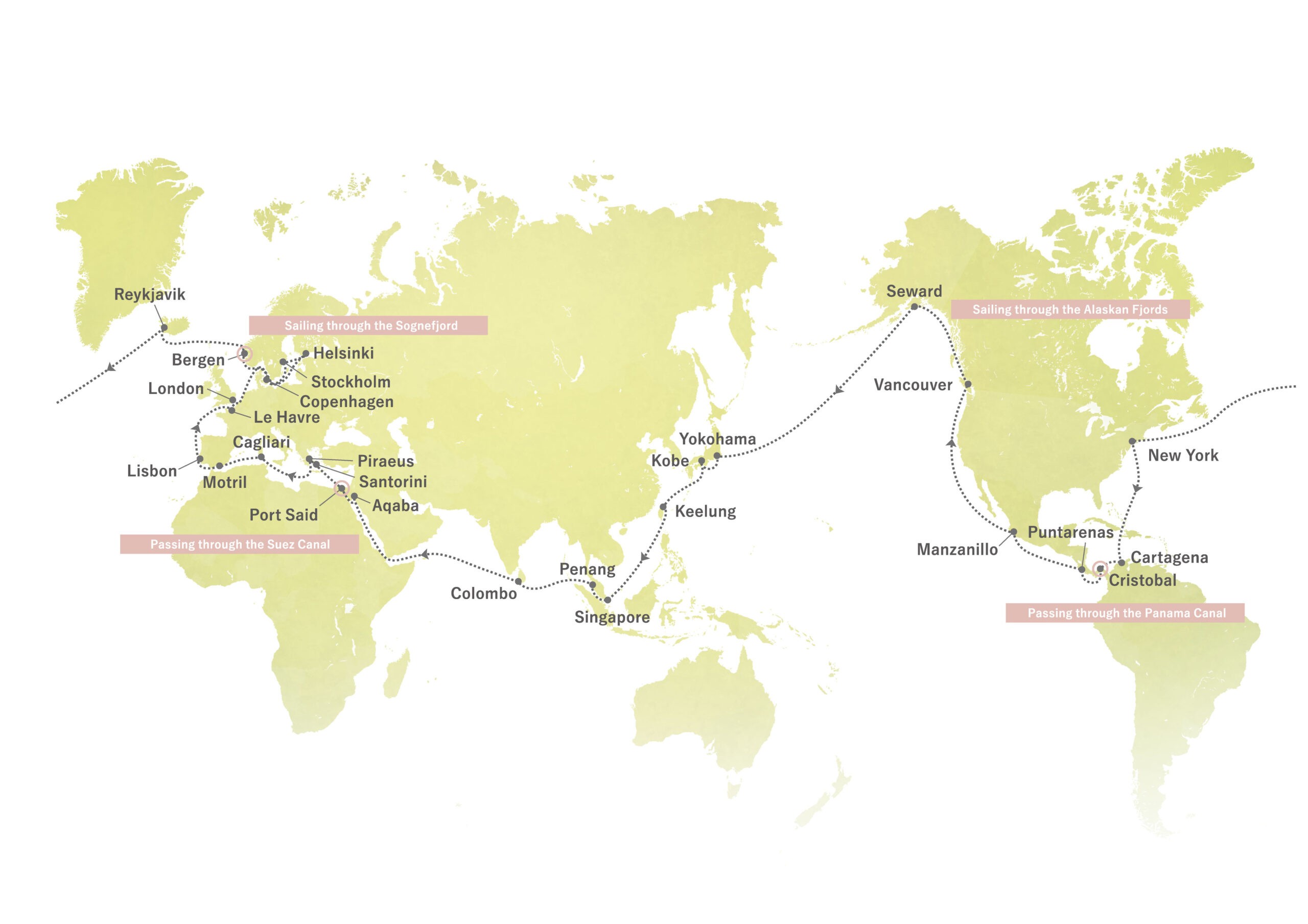 | Piraeus, Greece | May 10 | Manzanillo, Mexico | June 28 | |